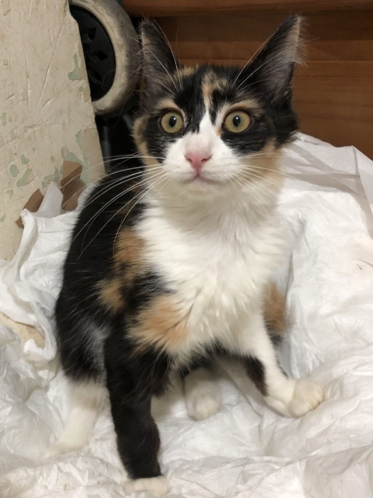 This adorable, fluffy kitten may be tiny, but she sure knows how to make herself heard! About 2 months old, she was found meowing her heart out until she was finally rescued; after patiently waiting, she decided to enter the trap we had set for her (helped by a recording of cat meows and a tasty can of food!).